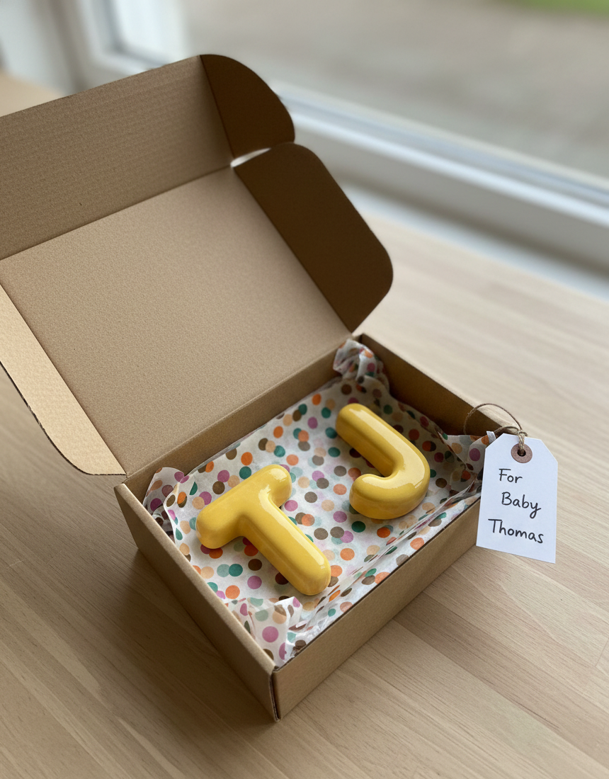 Melissa H., USI chose bisque letters and glazed them in the exact shade I wanted at a local studio. I wasn’t sure what to expect, but the quality was excellent and the result feels completely custom.