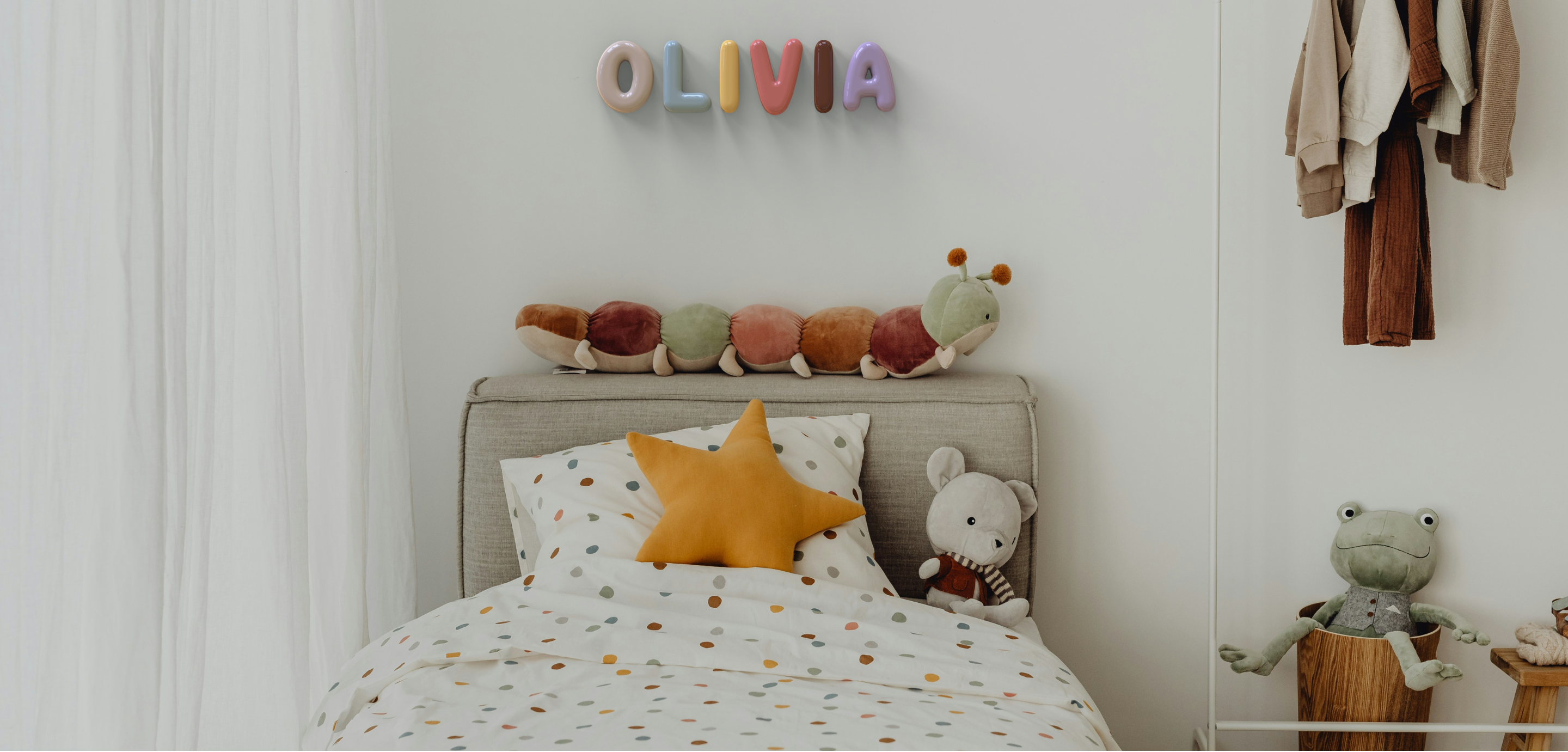 Create a cozy and personalized nursery with our handcrafted ceramic wall letters. Designed especially for nursery wall decor, each letter from A to Z helps you spell out your child’s name or meaningful words with style. These nursery wall letters add a soft, timeless touch to baby rooms, making them feel warm, unique, and truly yours.